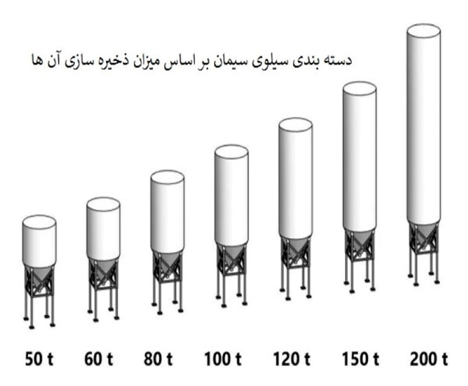 1- یکی از دستهبندی ها بر اساس حجم است در این حالت با توجه به میزان سیمانی که در سیلوها جای می گیرد . انواع سیلوی در ظرفیت های مختلف شامل سیلوی : 50 تن ، 60 تن ، 80 تن ، 100 تن ، 120 تن ، 150 تن ، 200 تن تا 5000 تن می باشد.